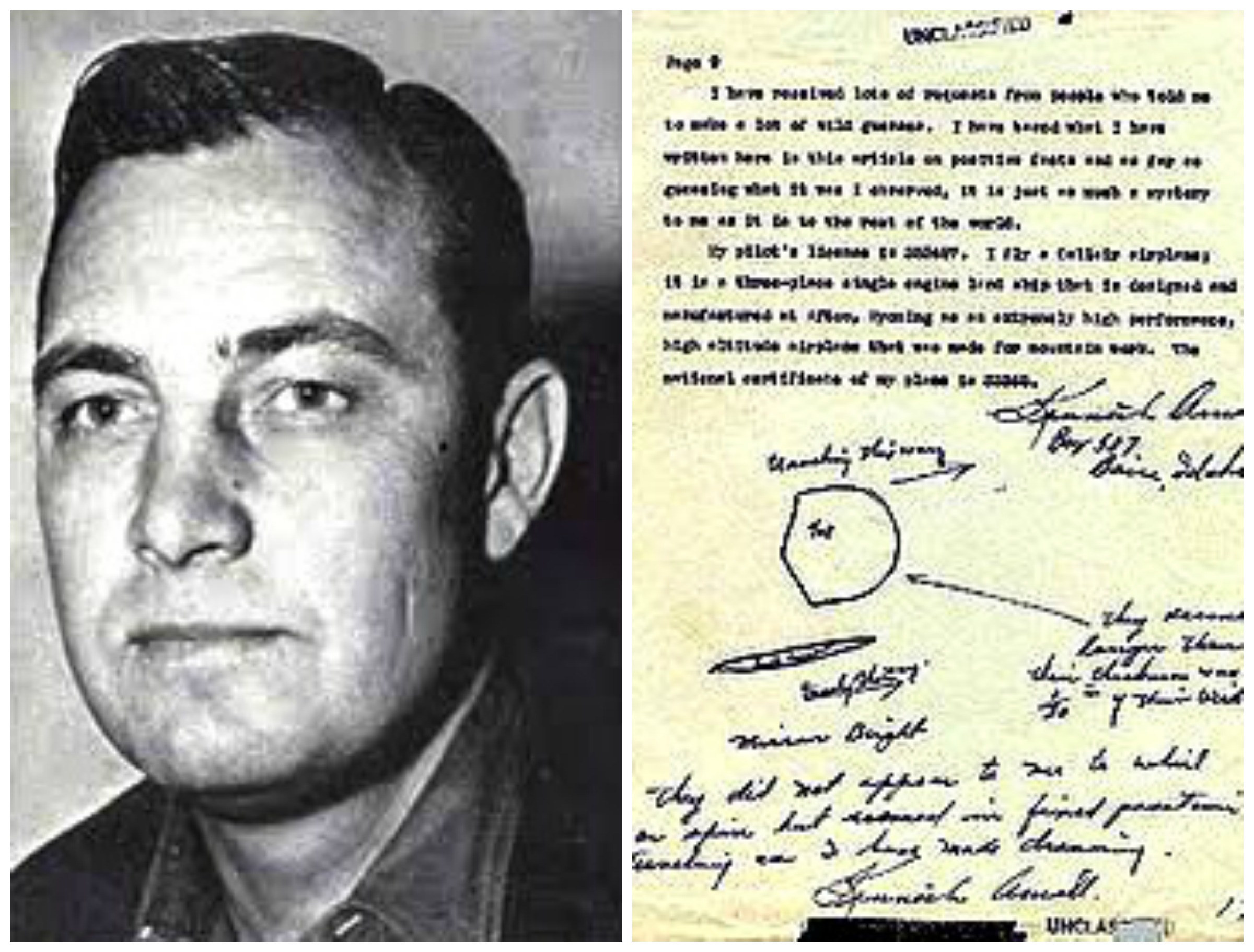 Todo acontece un día 24 del mes de junio. Un piloto aficionado de nombre Kenneth Arnold, sobrevolando la altiplanicie del monte Ramier al noroeste de EE. UU. (Washington), observó como siete extraños objetos voladores con formas triangulares se desplazaban por el cielo a una velocidad cercana a la supersónica. Indeciso de precisar si era real lo que había visto, decidió comunicarlo a la prensa local. Cuando lo notificó a la prensa, esta se encargó de tergiversar ciertos detalles, Kenneth describió a los objetos con formas triangulares que se desplazaban como «platillos» rebotando sobre el agua, pero la Associated Press, publicó que el piloto había avistado platillos volantes. Y Así, fue como apareció en los medios de comunicación: Platillos Volantes, en un gran titular. La repercusión fue enorme. En los días sucesivos, cientos de personas notificaron telefónicamente, a distintas dependencias gubernativas, avistamientos de «Platillos Volantes«.