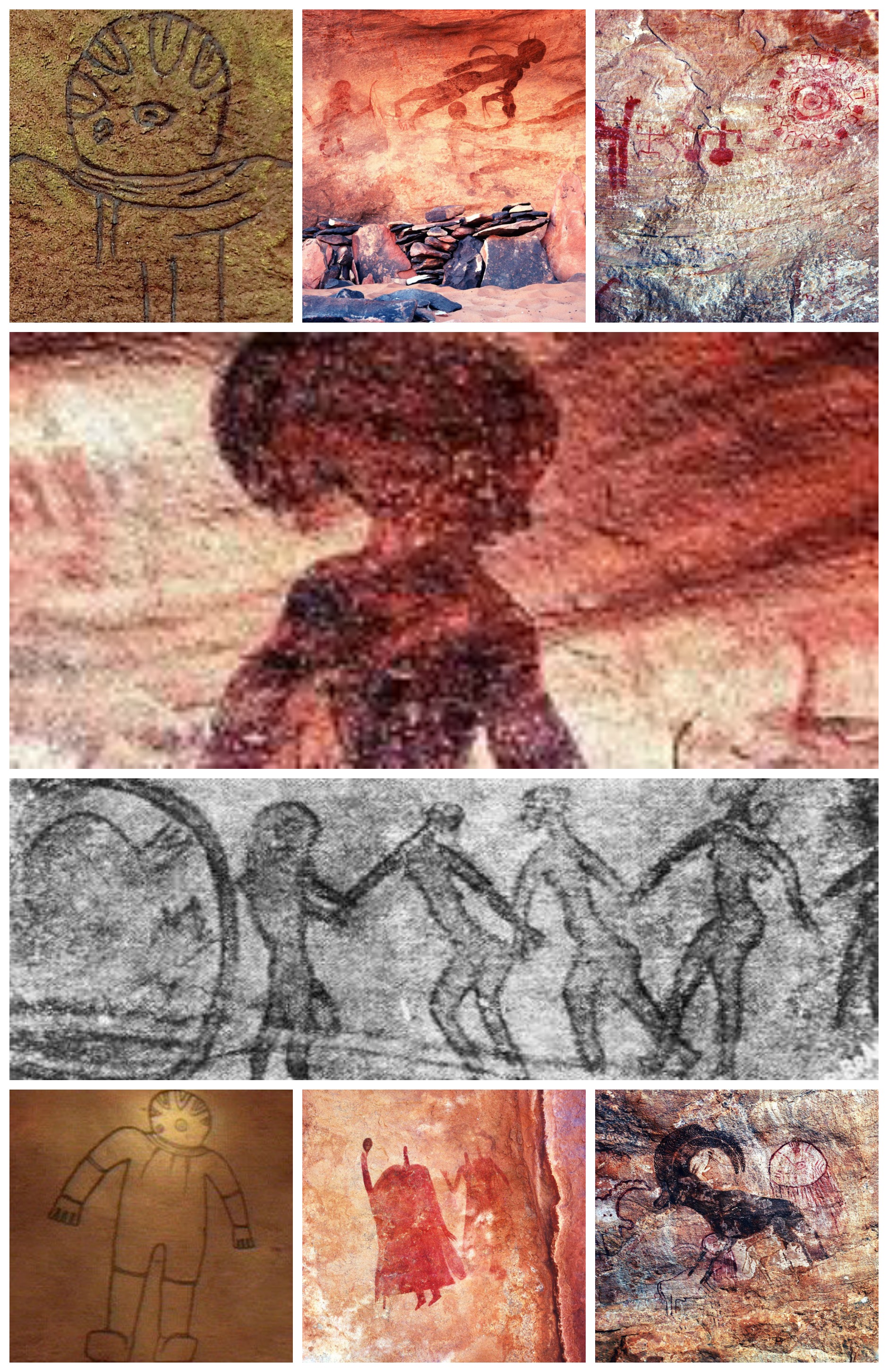 En la observación de estas pinturas que datan de 10 a 15 mil años de antigüedad, vemos pintados a seres embutidos en algo semejante a uniformes y provistos de «cascos» muy parecidos al de los astronautas. Debido al gran nivel de detalles que se reflejan en estas pinturas, los investigadores afirman que, sin duda alguna, estos grabados no fueron producto de la imaginación de sus autores, sino que mostraban lo que estaban viendo. Algo que hace suponer que, siempre desde el punto de vista de estas investigaciones, los habitantes de Tassili contactaron con seres siderales. Alexei Kazantsev, arqueólogo ruso que visitó en 1962 Tassili, denominó a estas pinturas «los Marcianos de Tassili».