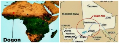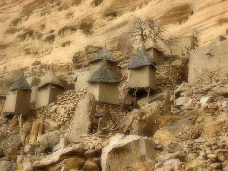 En la república de Malí, un país del África Occidental, situada en la frontera del Sahara con las sabanas y a una distancia de 1.500 kilómetros del Atlántico, habita el pueblo Dogon. Pegadas a las paredes del acantilado de Bandiagara se extienden unas construcciones de barro con techo de paja, algunas a 200 metros del suelo, allí, vive la tribu Dogon. Hace más de medio siglo que, debido a su carácter pacífico, erigieron las casas en zonas abruptas como estos acantilados, para protegerse de los ataques de otras tribus. El origen exacto de los dogones es impreciso. Algunos estudios afirman que descienden de los egipcios.