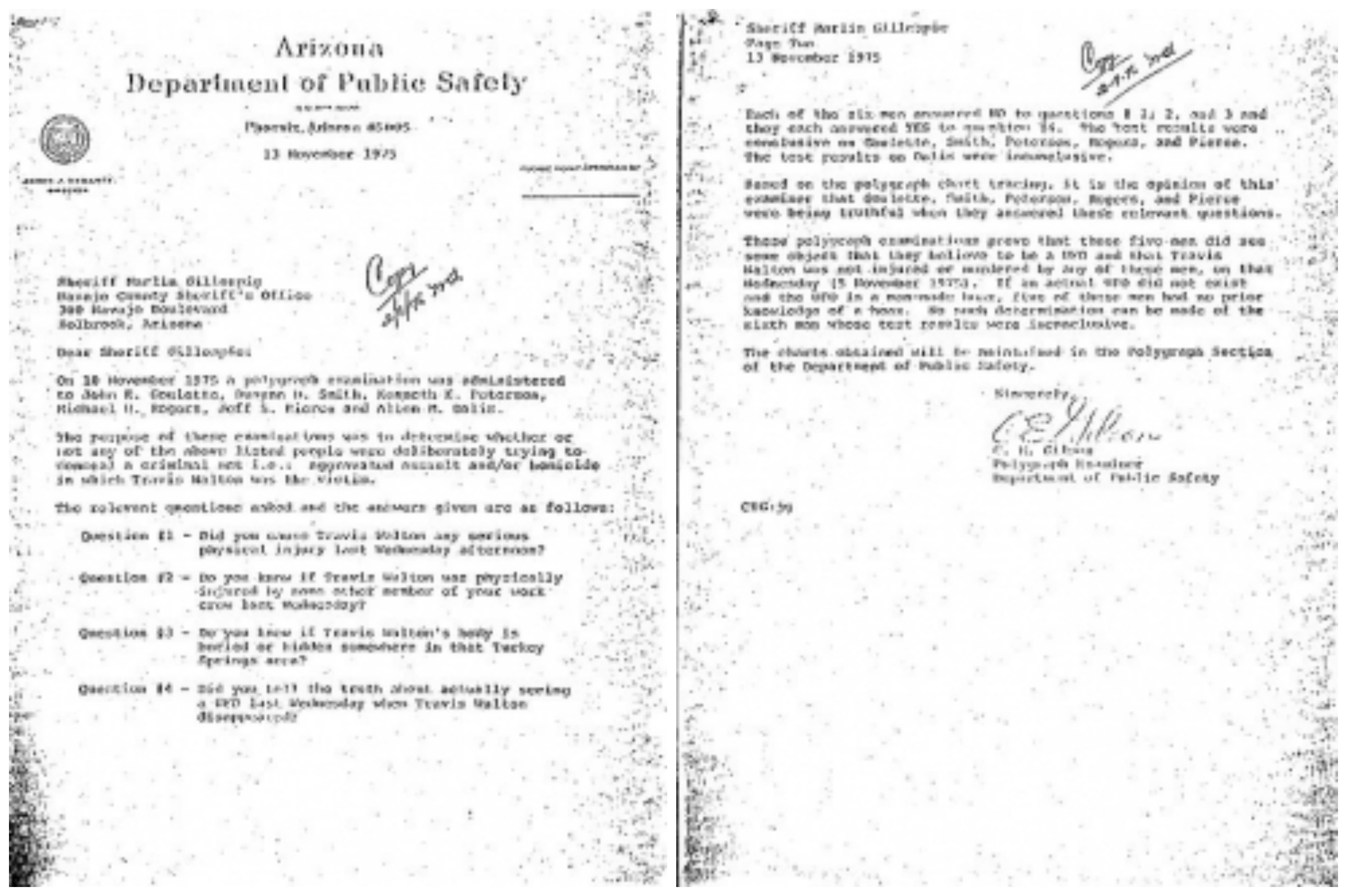 Una vez que la policía escuchó el testimonio de Travis Walton, la conclusión que obtuvieron fue semejante a la del incidente de la desaparición. Un relato fantástico que desafiaba todo lo conocido hasta entonces y que desde luego era difícil de creer. La experiencia con el grupo sirvió que sin dilación alguna sometiera a la prueba del polígrafo a Travis Walton.